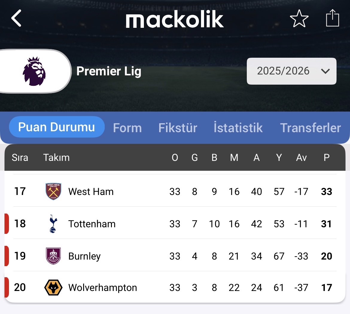Turuncu-siyahlılar, West Ham'ın Crystal Palace karşısında aldığı puanla matematiksel olarak ligde kalma şansını kaybetti.